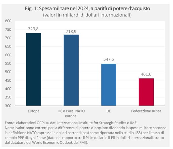 Nella spesa europea è conteggiata UK perché condividiamo la stessa porzione geografica e include alcune nazioni europee non UE ma NATO (Norvegia). Infine, va ricordato che la Russia finanzia un conflitto in atto ed ha una estensione geografica di quattro volte quella UE, oltre ad essere da sempre in posizione concorrente alla massima potenza militare del mondo, gli USA.