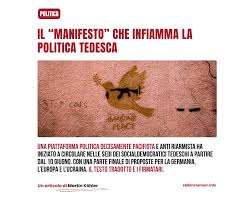 n Germania il varo della politica bellicista e di riarmo, sostenuta con vigore ed entusiasmo dal cancelliere Merz, risale in realtà al suo predecessore, il socialdemocratico Olaf Scholz. E la SPD, il più grande partito socialdemocratico europeo, si è allineata e continua, oggi, a sostenerla all’interno del Governo di coalizione. Nelle elezioni politiche di pochi mesi fa, peraltro, la SPD ha riportato una vera disfatta, raccogliendo il minimo storico dei voti (il 16,4%) e finendo al terzo posto tra i partiti politici, superato anche dall’estrema destra di AFD. Ciò ha imposto l’anticipazione del suo congresso, che si terrà a giorni, dal 27 al 29 giugno. Nell’imminenza del congresso, il 10 giugno, il settimanale Der Stern ha pubblicato un manifesto dal titolo “Garantire la pace in Europa attraverso la capacità di difesa, il controllo degli armamenti e la ricerca di un’intesa” sottoscritto da un centinaio di esponenti di alto livello del partito, parlamentari, ex componenti del Governo federale, intellettuali, scienziati, sindacalisti. Molte anche le firme di donne, in gran parte appartenenti ai “Circoli di pace SPD”, e di aderenti al movimento giovanile del partito. Il manifesto, seppur moderato, è schierato su posizioni pacifiste e contrarie al riarmo e propone un approccio opposto a quello dominante sia in tema di sicurezza che di rapporti con la Russia. Ciò – superfluo dirlo – sta provocando, nel Paese, aspre critiche. La sua pubblicazione è un contributo alla conoscenza delle (poche) posizioni critiche, a livello istituzionale, nei confronti delle leadership europee. (la redazione)