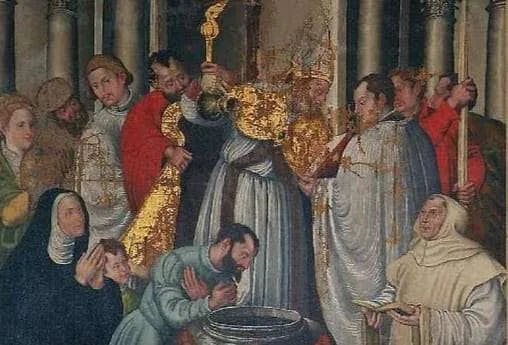 «Sant’Ambrogio battezza Sant’Agostino d’Ippona», olio su tavola del 1550 di Benedetto Nucci. Foto Public Domain.