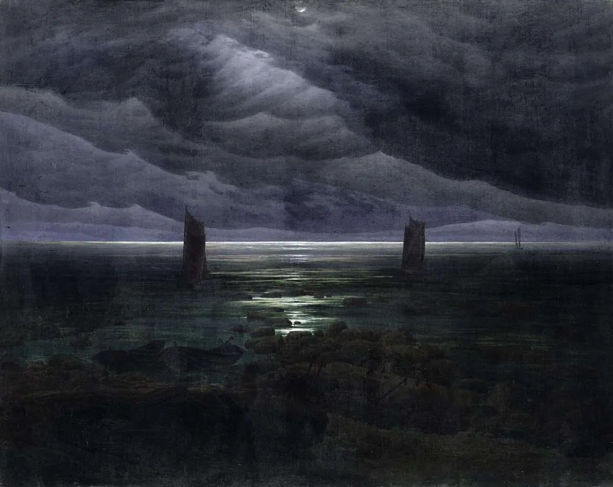 «Costa al chiaro di luna», dipinto da Caspar David Friedrich nel 1835/1836. Wikimedia Commons. Public Domain.