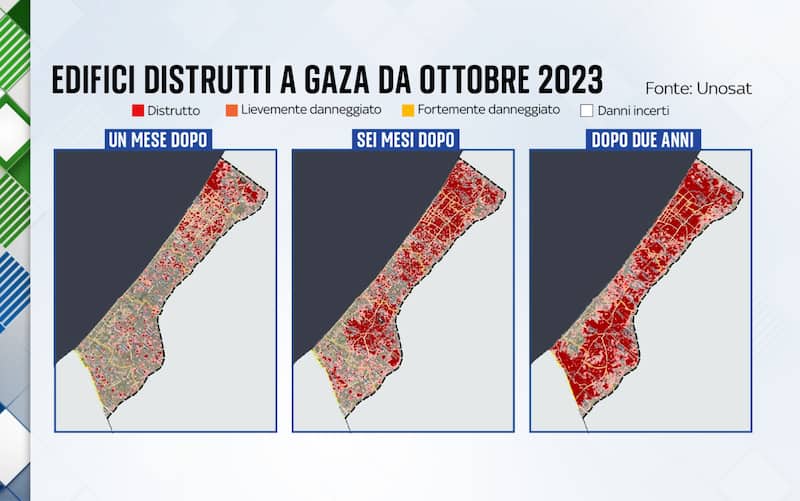 - Si aprirà poi il tema della ricostruzione. Infatti le elaborazioni frutto delle immagini satellitari mostrano la progressione della distruzione nella Striscia di Gaza, con gli edifici distrutti nel tempo evidenziati in rosso. Sono quasi 200mila le strutture rase al suolo o danneggiate.
