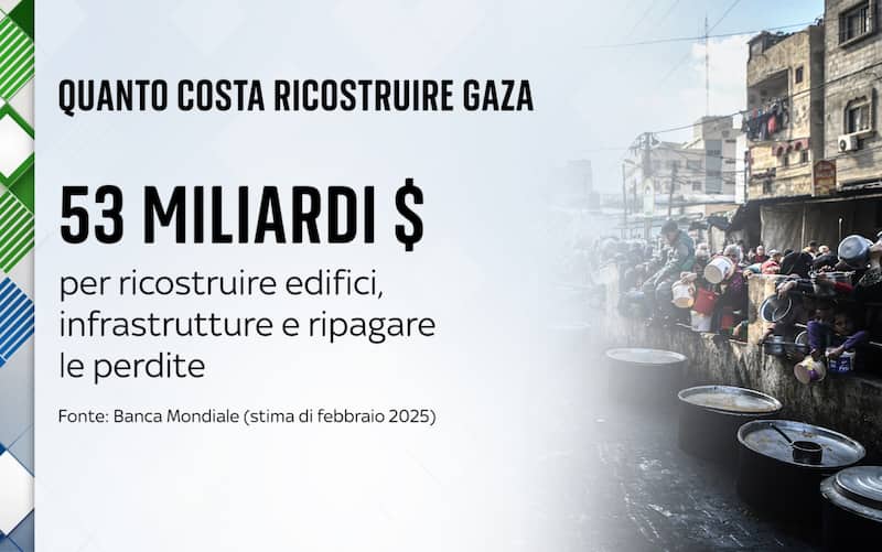 - Ma quanto denaro sarà necessario per ricostruire gli edifici e le infrastrutture a Gaza? Secondo una stima della Banca Mondiale risalente a febbraio 2025 la cifra necessaria sarà di 53 miliardi di dollari. La cifra rappresenta tre volte tanto il Pil della Palestina.