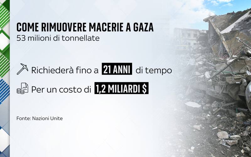- Dopo l’accordo per la prima fase, un ruolo fondamentale nel processo di pace tra Hamas e Israele sarà giocato dalla ricostruzione della Striscia di Gaza. Uno dei punti della proposta del presidente degli Stati Uniti Donald Trump prevede che, oltre agli aiuti che devono subito arrivare nella Striscia, si debba subito iniziare a rimuovere detriti e macerie.