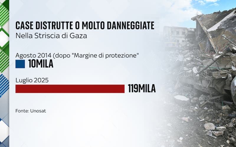 - Ricostruire Gaza richiederà tanto denaro e tanto tempo. Facendo un confronto storico, nell’agosto 2014 dopo l’operazione israeliana “Margine di protezione” le case distrutte o gravemente danneggiate nella Striscia furono 10mila. A luglio del 2025, invece, erano 119mila.