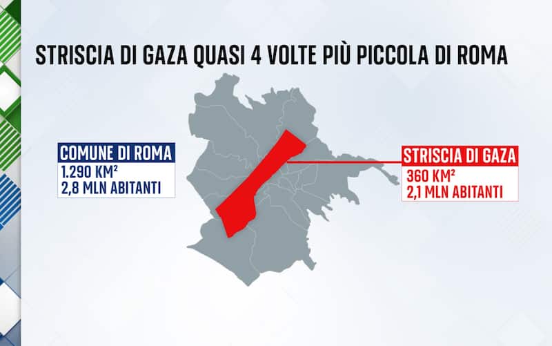 - Inoltre è bene ricordare che si parla di un’area più piccola di quanto si possa pensare. La grafica mostra il confronto tra la Striscia di Gaza e il comune di Roma, che è quasi quattro volte più grande.