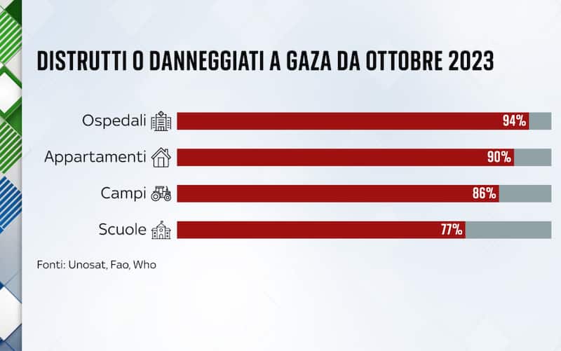 - Nel dettaglio, nel corso della guerra sono stati distrutti a Gaza il 94% degli ospedali, il 90% degli appartamenti, l’86% dei campi non sono più coltivabili, il 77% delle scuole e il 65% delle strade.