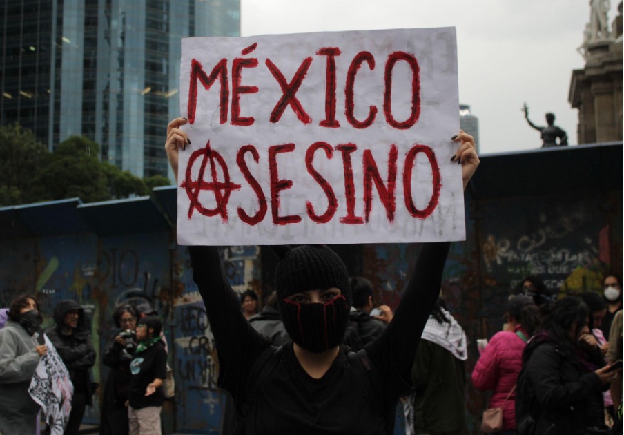 Manifestante della marcia del 26 settembre con un cartello con la scritta: “Messico assassino”. (Foto: Sofia Pontiroli)
