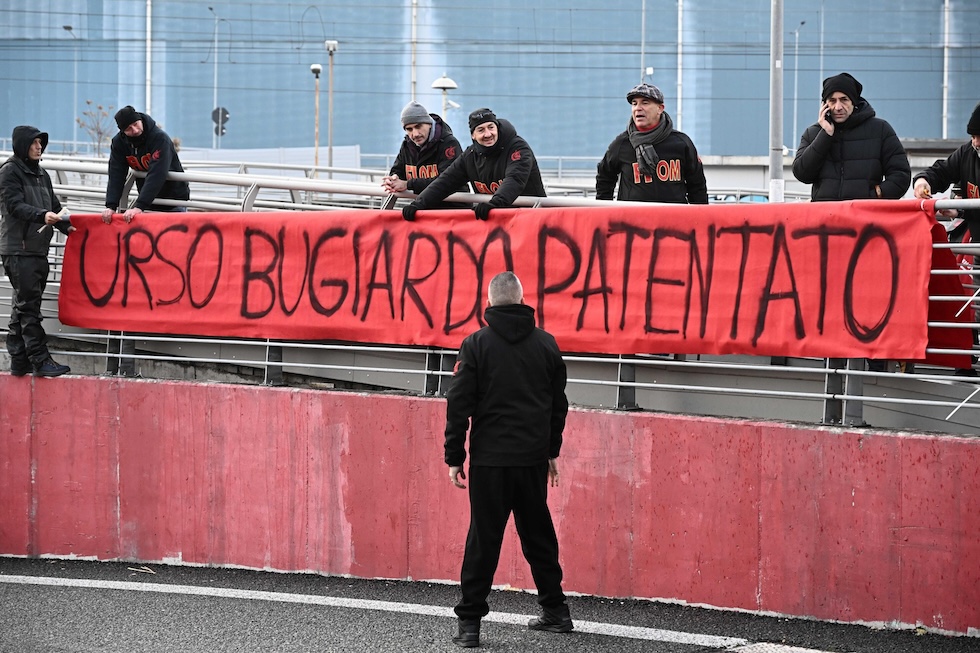 I lavoratori dell’ex ILVA di Genova con uno striscione contro il ministro delle Imprese e del Made in Italy Adolfo Urso, 1 dicembre 2025 (ANSA/LUCA ZENNARO)