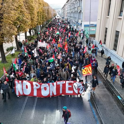 Oggi, collegati con la manifestazione che intanto si svolge a Roma, questo luogo è anche la Palestina. Perché Gaza è oggi il nome comune di ogni ingiustizia e perché il progetto di ricostruzione di Gaza è la manifestazione più feroce delle politiche estrattiviste e coloniali di cui anche il ponte è espressione. Quelle stesse politiche estrattiviste e coloniali che portano con sé morte e repressione, repressione che colpisce i movimenti con arresti, multe, misure sempre più restrittive della libertà di manifestare.