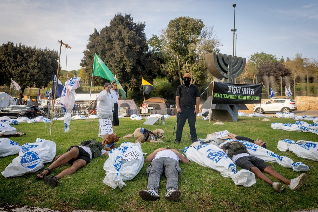 I soldati israeliani che soffrono di PTSD organizzano una protesta chiedendo migliori diritti e condizioni, fuori dalla Knesset, Gerusalemme, il 3 novembre 2025. (Chaim Goldberg/Flash90)