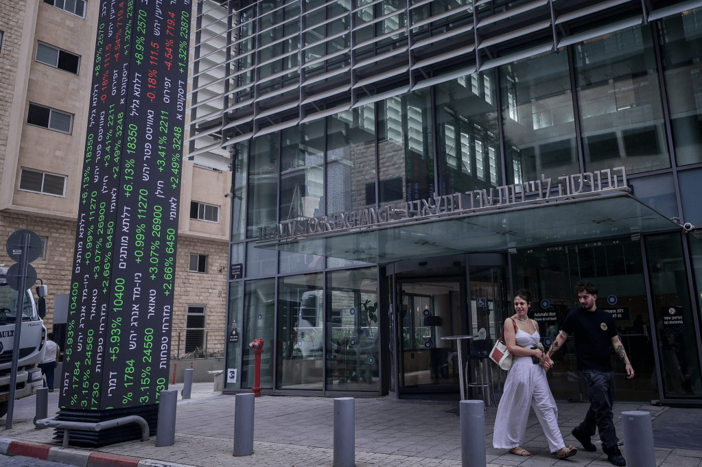 La gente cammina vicino alla Borsa di Tel Aviv, 8 ottobre 2025. (Avshalom Sassoni/Flash90)