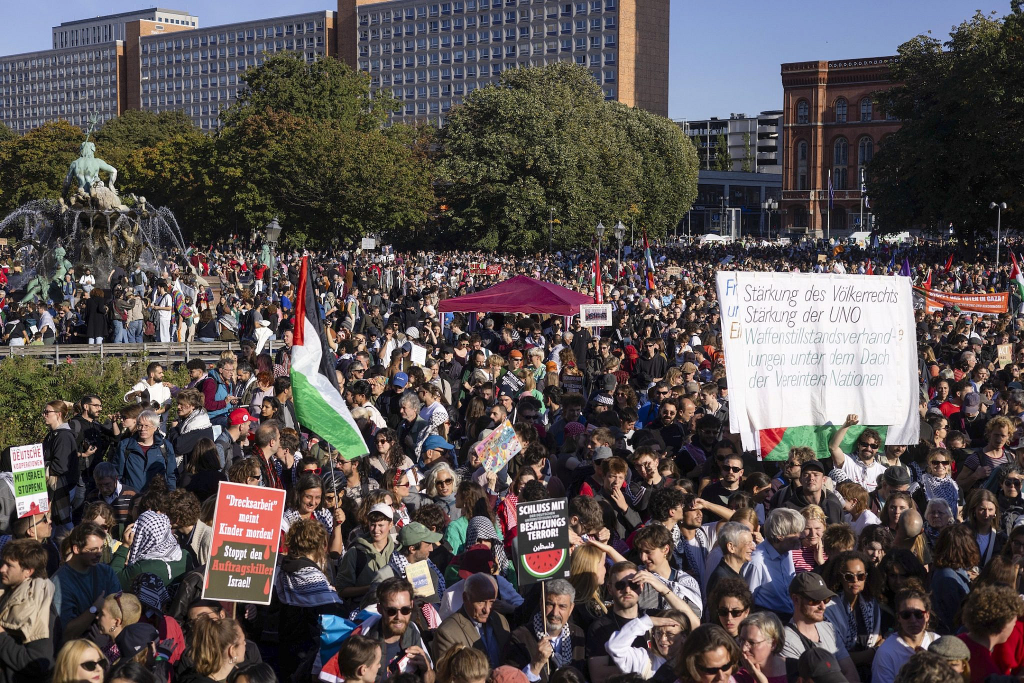 Oltre 100.000 manifestanti chiedono la fine del genocidio a Gaza, in Alexanderplatz, Berlino, Germania, 27 settembre 2025. (Oren Ziv/Activestills)