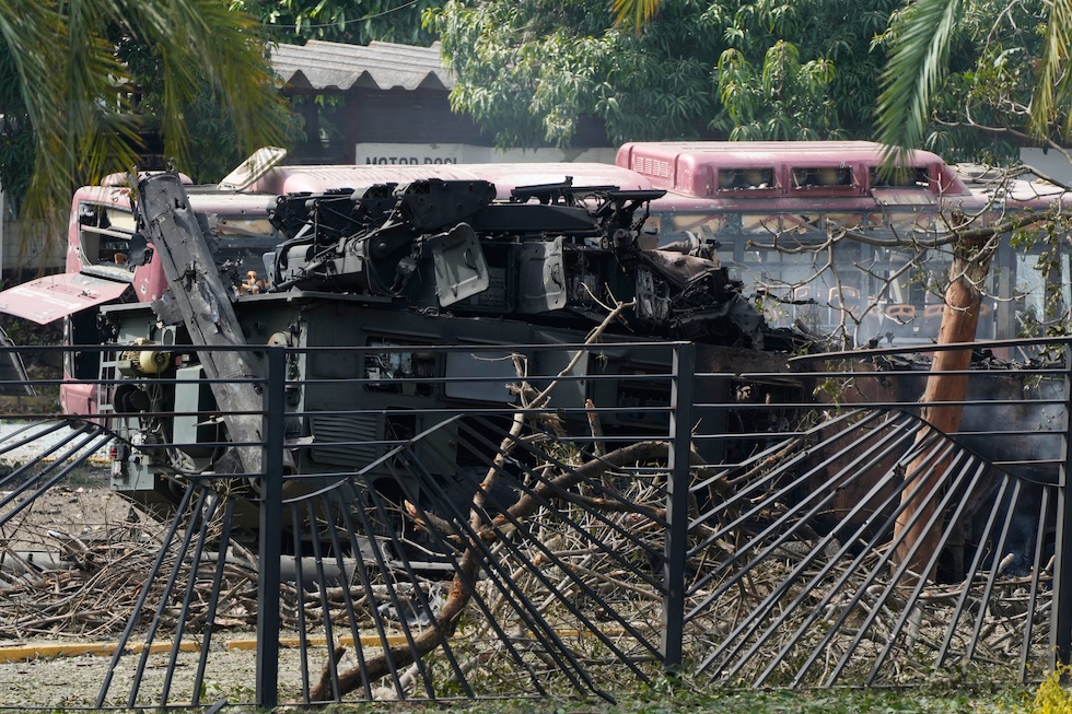 Un mezzo blindato distrutto vicino alla base aerea della Carlota, a Caracas, che è stata uno degli obiettivi colpiti dagli Stati Uniti (AP Photo/Ariana Cubillos)