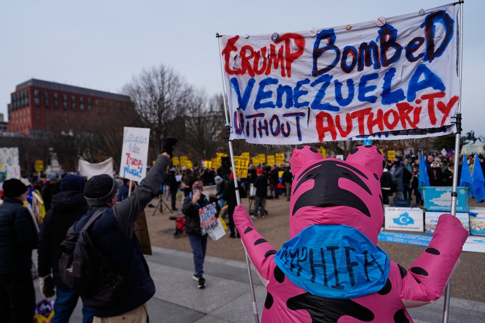 Alcuni manifestanti di fronte alla Casa Bianca, 3 gennaio 2026 (AP Photo/Julia Demaree Nikhinson)