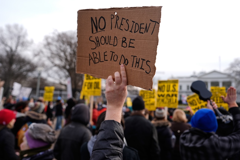 Un cartello con scritto «Nessun presidente dovrebbe poter fare questo», 3 gennaio 2026 (AP Photo/Julia Demaree Nikhinson)