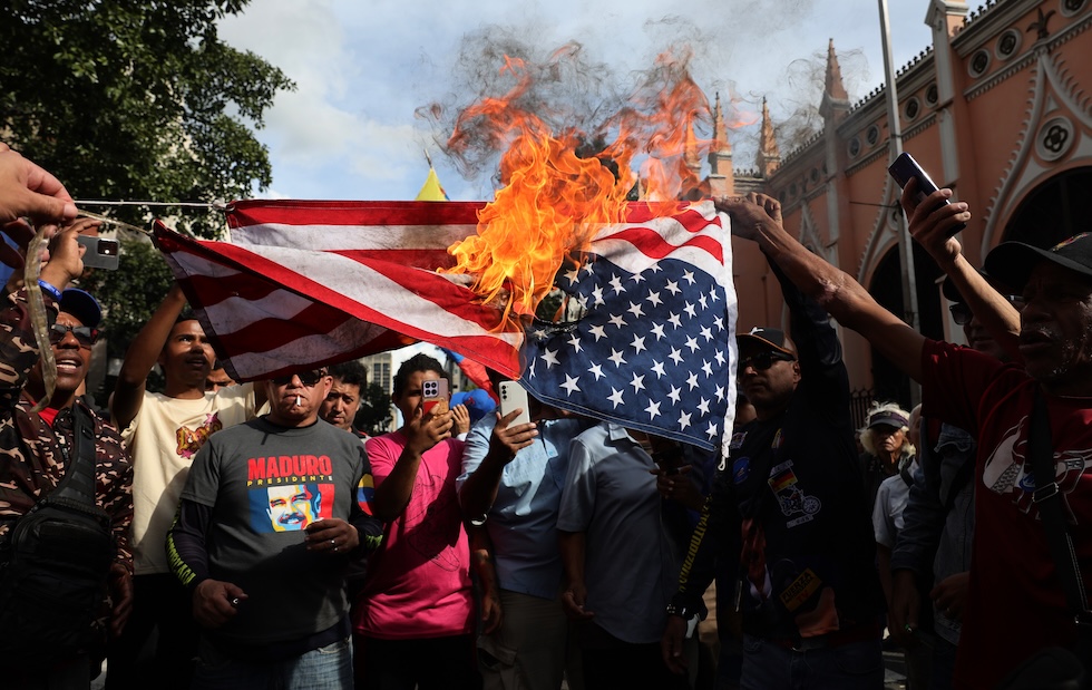 Un gruppo di sostenitori di Maduro brucia una bandiera statunitense (Jesus Vargas/Getty Images)