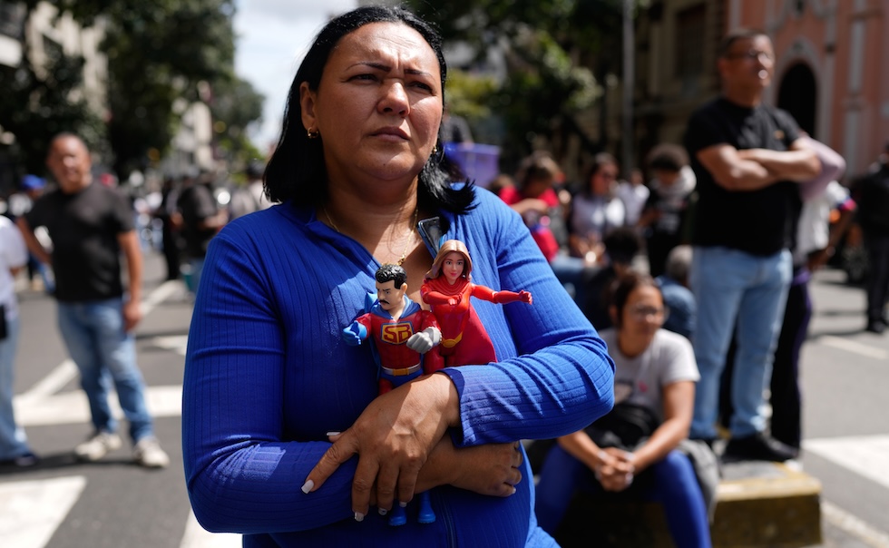 Una sostenitrice di Maduro tiene tra le braccia “Super Bigote” (qualcosa come Super Baffi) and “Cilita”, le bambole di Maduro e sua moglie Cilia Flores (AP Photo/Ariana Cubillos)