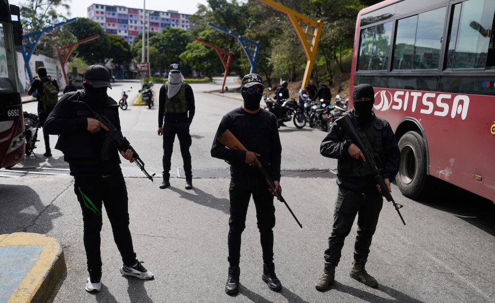 Un gruppo di civili armati blocca una strada di Caracas (AP Photo/Matias Delacroix)