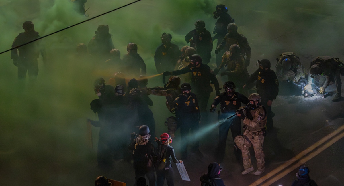 Scontri tra manifestanti e agenti delle forze dell’ordine fuori da un centro dell’ICE a Portland, in Oregon, il 19 giugno 2025 (Jan Sonnenmair/Getty Images)
