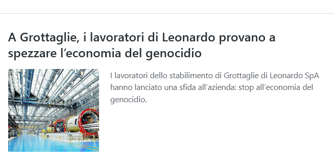 Così, dopo i lavoratori dello stabilimento Leonardo di Grottaglie, anche una compagine di dipendenti torinesi del Gruppo ha deciso di levare la propria voce per chiedere di affrontare il tema collettivamente nelle assemblee sindacali e promuovere soluzioni durature che pongano fine alla complicità del colosso nel genocidio del popolo palestinese, in primis. Ma anche per riabilitare la reputazione della multinazionale italiana agli occhi della società civile.