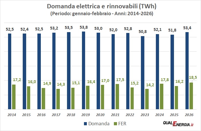 Nel grafico in basso la domanda di energia elettrica e la generazione da rinnovabili in termini assoluti nei primi bimestri, dal 2014 al 2026.