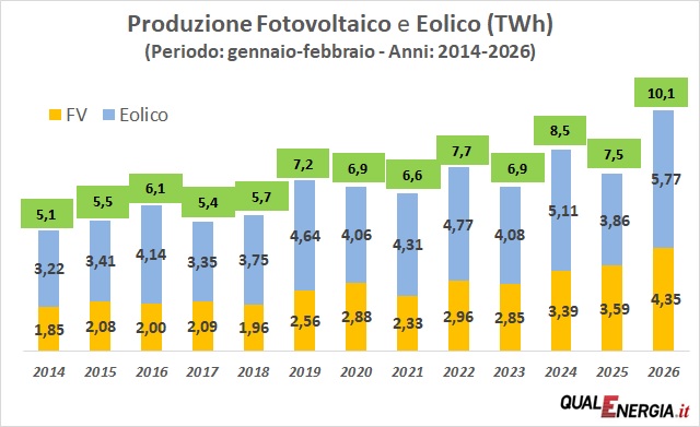 Nei primi due mesi del 2026 risulta in lieve diminuzione la generazione idroelettrica (-227 GWh). Fotovoltaico ed eolico insieme, con 10,1 TWh, hanno aumentato il loro contributo di 2,6 TWh rispetto allo stesso periodo di un anno fa. Un dato significativo per questi due mesi invernali.