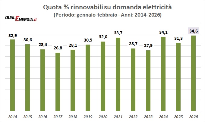 Le rinnovabili nel periodo gennaio-febbraio 2026 hanno coperto il 34,6% della domanda elettrica contro il 31,3% dell’anno precedente. Si tratta della percentuale più alta finora raggiunta per questi due mesi. In termini di copertura della produzione interna, la quota è del 39,6%.