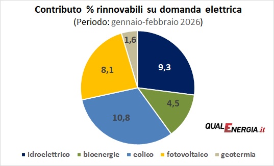 Su una richiesta di circa 25,3 TWh, le rinnovabili elettriche hanno generato 9,6 TWh, il dato più elevato di sempre per febbraio (+2,1 TWh sul 2025). Le Fer hanno così coperto il 37,9% della domanda mensile (era il 30,3% un anno fa) e quasi il 45% della produzione elettrica nazionale.