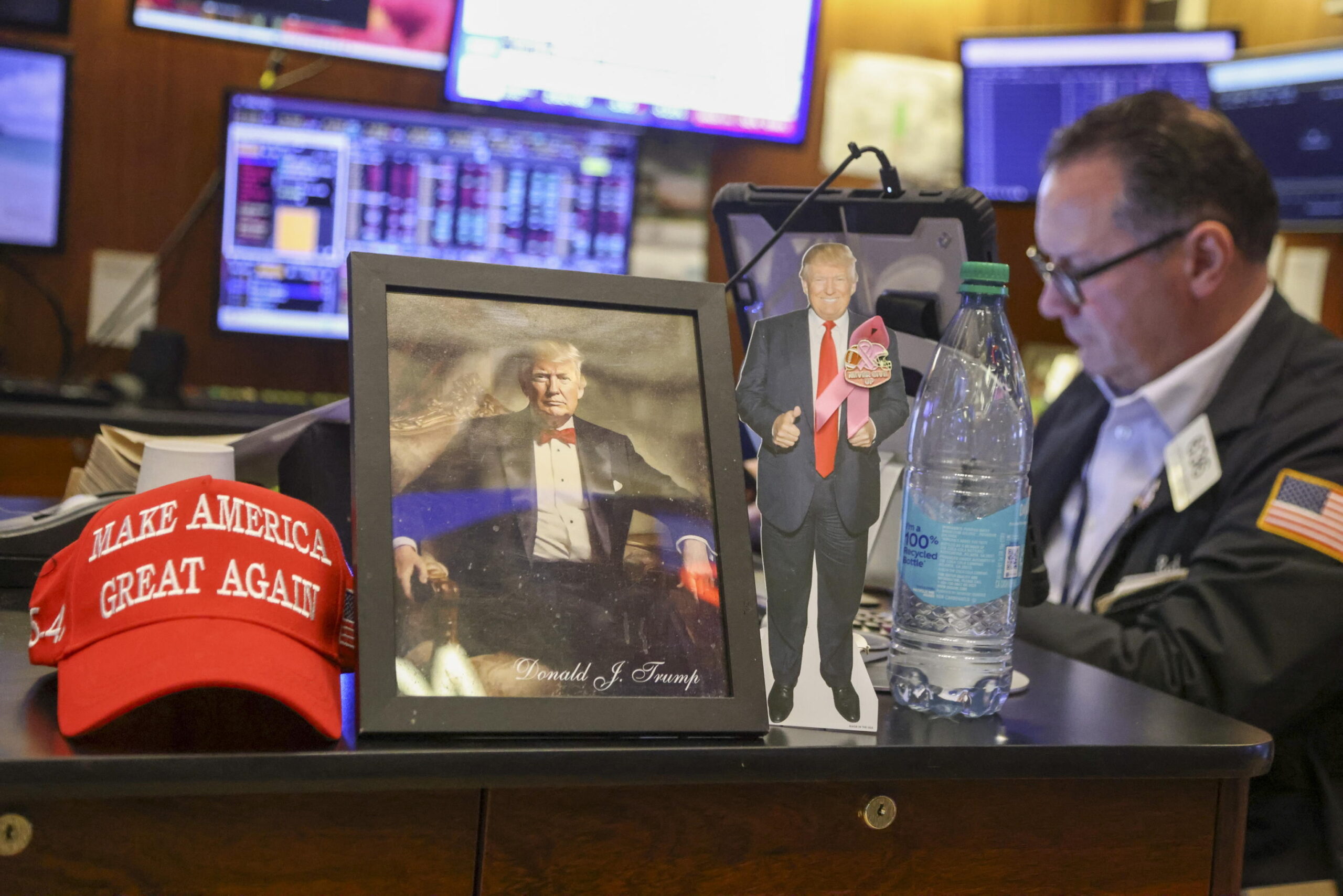 Un ritratto del presidente degli Stati Uniti Donald Trump esposto accanto ad un operatore della Borsa di New York 13 aprile 2026. ANSA EPA/SARAH YENESEL