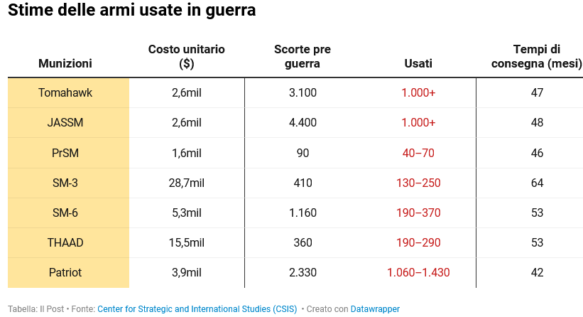 Le scorte di munizioni per le difese antiaeree sono state consumate in misura maggiore. Gli Stati Uniti hanno usato circa due terzi dei missili intercettori Patriot, quelli impiegati estesamente anche dai paesi del Golfo attaccati dall’Iran come ritorsione, e l’80 per cento degli intercettori THAAD.