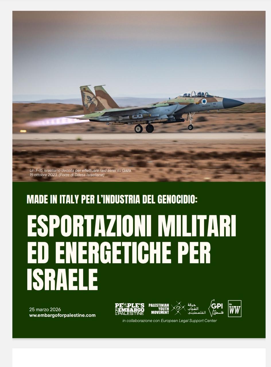 - il ruolo di porti e aeroporti italiani come punti di partenza e di passaggio delle catene logistiche che sostengono il “lavoro sporco” (secondo la cruda espressione usata dal cancelliere tedesco Friedrich Merz) che sta svolgendo Israele, in guerra contro tutti i suoi vicini;